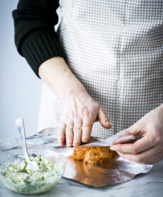 Lavora 100 g di burro fino a ottenere una crema soffice; dividila a metà e unisci a una parte un cucchiaio di prezzemolo tritato e all'altra un cucchiaino di concentrato di pomodoro e un peperoncino fresco tritato. Avvolgi i burri in fogli d'alluminio, formando 2 cilindretti, falli rassodare in frigo.