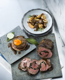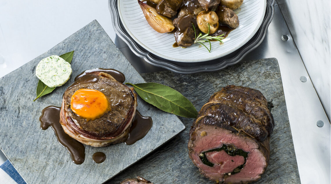 Rosola 4 tournedos, prima avvolti nella pancetta e legati, con 30 g di burro, spruzzali con un bicchierino di brandy, fallo evaporare e cuoci 2 minuti per lato. Servili caldissimi guarniti con i burri aromatizzati a fettine.