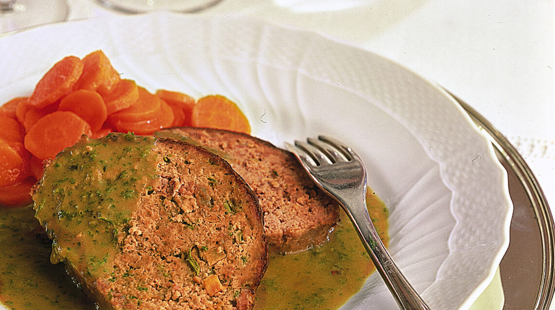 3 Cuocete il polpettone nel forno caldo a 180°per 30 minuti. Bagnatelo con il vino e proseguite la cottura per altri 20 minuti. Frullate il fondo e servitelo con il polpettone a fette, accompagnandolo a piacere con carote al burro.