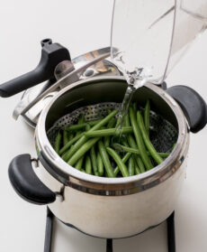 Lavate i fagiolini, spuntali e mettili in un cestello per la cottura al vapore. Disponete il cestello nella pentola a pressione, versate acqua con una brocca fino a sfiorare il fondo del cestello, chiudete, accendete il fuoco al massimo e aspettate il sibilo. Cuocete per 2 minuti, spegnete e lasciate sfogare il vapore. Estraete il cestello e lasciate raffreddare i fagiolini; eliminate l'acqua rimasta nella pentola e asciugatela.