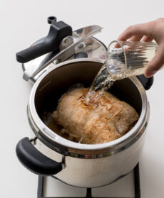 Scaldate 2 cucchiai di olio e una noce di burro nella pentola a pressione. Rosolate il rotolo su tutti i lati a fiamma medio-alta, girandolo con 2 cucchiai di legno. Sfumate con il vino, regolate di sale e pepe e versate 1 dl scarso di brodo caldo. Chiudete con il coperchio e alzate la fiamma al massimo; dopo il sibilo abbassate il fuoco al minimo e cuocete per circa 40 minuti. Spegnete e lasciate sfogare il vapore. Se il fondo di cottura risultasse troppo fluido, accendete ancora il fuoco e lasciate restringere senza il coperchio. Servite il rotolo tiepido a fette a piacere con insalatine novelle.