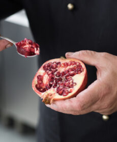 Tagliate a metà 3 melagrane, estraete i chicchi con un cucchiaino, frullateli e filtrate il succo ottenuto.