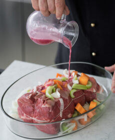 Aggiungete le rimanenti verdure a pezzetti, rosolate anche queste, poi irrorate il tutto con il vino della marinata; salate, pepate e fate cuocere in forno a 160° per 2 ore.