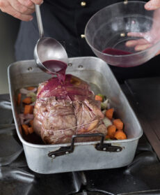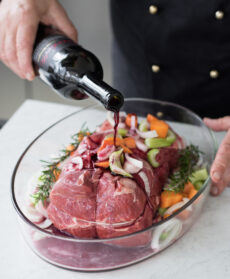 Aggiungete i rametti di rosmarino, versate sulla carne il vino e lasciatela marinare per 12 ore in luogo fresco, girandola ogni tanto.