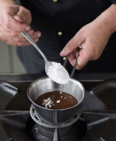 A fine cottura, scolate la carne e tenetela da parte; versate il sugo in una casseruolina e fatelo addensare aggiungendo un cucchiaino di fecola. Affettate la carne e servitela con il sugo e i chicchi della restante melagrana.