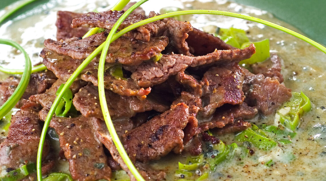 Straccetti di manzo al roquefort, un secondo gourmand, facile e veloce. Rosolati nel burro sono spruzzati di brandy e serviti con porri