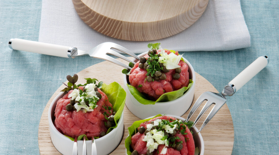 4) Completa con i capperini scolati, il cipollotto e il prezzemolo tritati. Servi la tartare di vitellone con la salsa d'uovo e la vinaigrette.