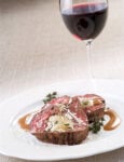 7) Ora togli i tournedos dal forno, mettili sui piatti, irrorali con della salsa al vino e decora ogni portata con delle foglie di salvia.