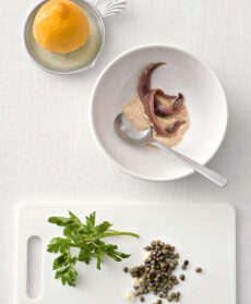 Per preparare il battuto secco di accompagnamento al vitello, trita le acciughe con i capperini e 1/2 spicchio d’aglio privato del germoglio centrale. In seguito disponi il battuto in una ciotola, aggiungi il pangrattato e il succo di 1/2 limone e schiaccia il tutto con il dorso di un cucchiaio.