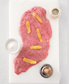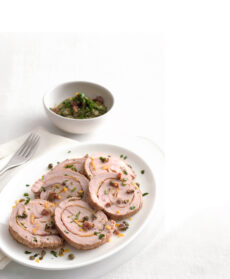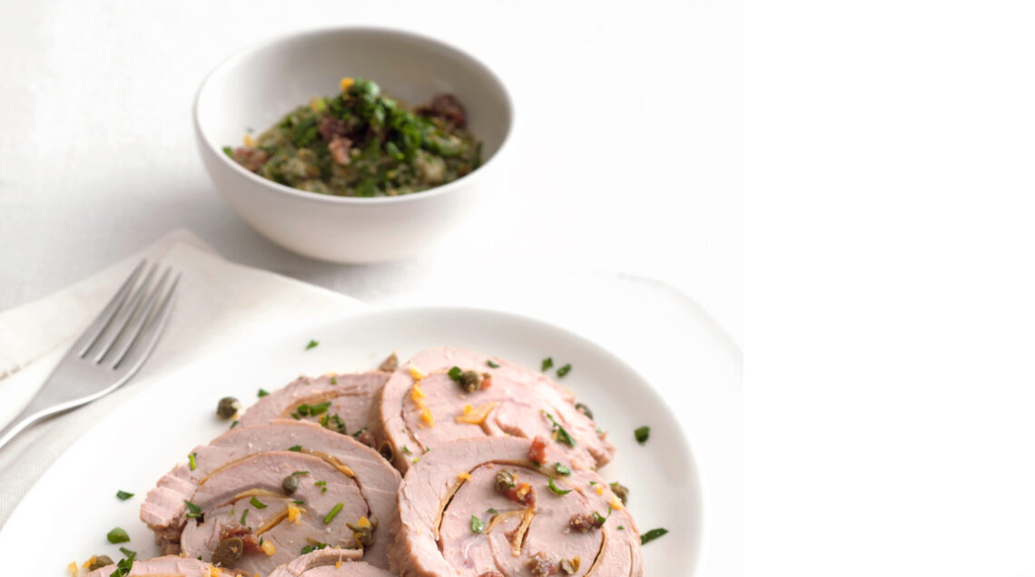 Prima di servire il vitello ad uso pesce-tonno, aggiungi al battuto aromatico poca scorza di limone grattugiata e 1 cucchiaio di prezzemolo tritato. Affetta la carne e cospargila con il mix di acciughe, capperi e pangrattato.