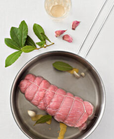 Disponi la carne in una casseruola con 1 litro di acqua fredda, l’aceto, l’aglio restante sbucciato, l’alloro e un paio di pezzi di scorza di limone. Cuocila per due ore a fuoco basso e poi lasciala raffreddare nel suo brodo, questo passaggio è fondamentale affinché la carne resti morbida.