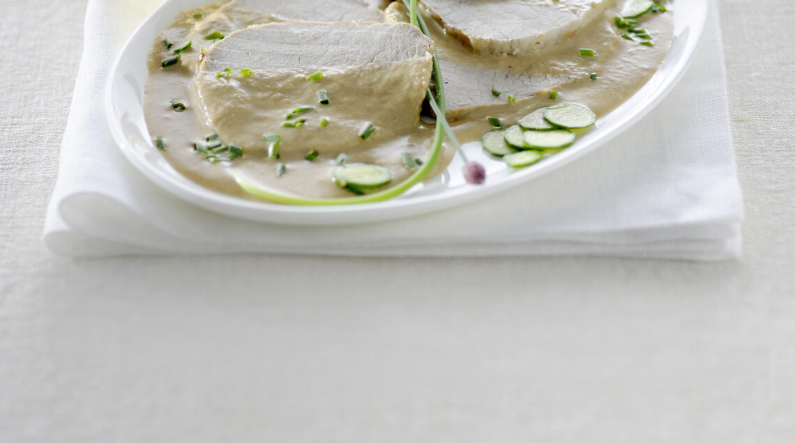 2) Frulla il fondo di cottura con l’aggiunta di tonno, tuorli e capperi dissalati. Taglia la carne in fette sottili, nappala con la salsa tonnata e decora con un trito di erba cipollina e le zucchine a fette.