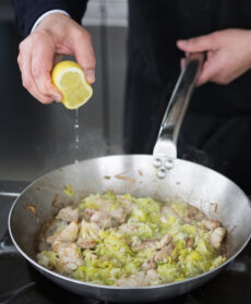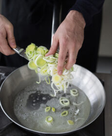 Le delicate frattaglie sono rosolate nel burro nocciola e servite assieme ai porri. Succo di limone e pepe bianco ne affinano il gusto