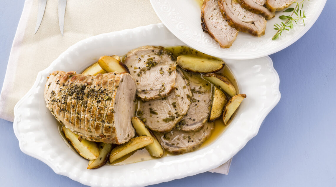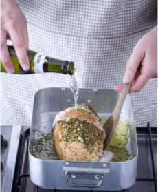 Tenera carne di vitello profumata con erbe aromatica e bagnata con spumante. La cottura al forno rende la polpa tenera e succosa