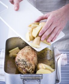 Passate in forno a 190° e cuocete per mezz'ora, bagnando ogni tanto l'arrosto con il suo fondo e versando, se necessario, qualche cucchiaio di brodo. Quindi unite 2 patate a spicchi, regolate di sale e cuocete un'altra mezz'ora abbondante.