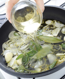 Fate stufare la cipolla a fettine con 3 cucchiai d'olio extravergine di oliva, l'aglio sbucciato, la salvia e l'alloro per 5 minuti. Salate, pepate, unite l'aceto, il vino e poco zucchero e cuocete per 8 minuti. Radunate carne e verdure in una pirofila, irroratele con il carpione caldo fate intiepidire e mettete in frigo per 3-4 ore.