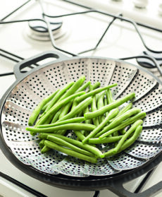 Lavate i fagiolini, spuntateli e cuoceteli al vapore per 12-15 minuti.