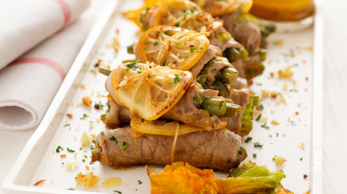Teneri bocconcini di vitello farciti con fagiolini. Gli involtini profumano di limone e sono guarniti con briciole di pane alle acciughe