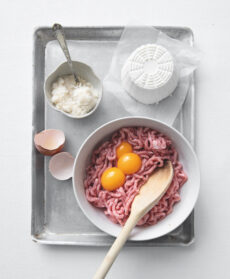 Riunite in una ciotola la ricotta romana, la carne trita, i tuorli, il parmigiano, un pizzico di sale e mescolate fino a ottenere un composto ben amalgamato. Inumidite le mani con acqua e modellate il composto in modo da ottenere un rotolo.