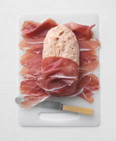 Stendete le fettine di prosciutto su un tagliere, in senso orizzontale, sovrapponendole leggermente. Posizionate al centro il rotolo, in senso verticale, e avvolgetevi intorno il prosciutto. Infine legate con più giri di spago da cucina.