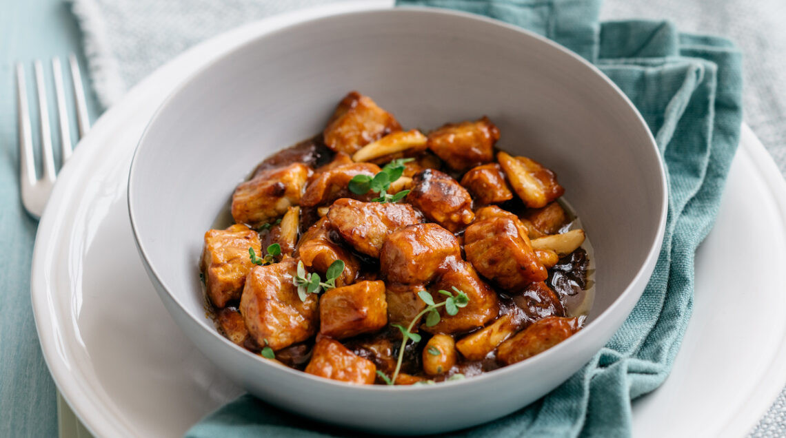 Un secondo di carne succulento, cucinato con mandorle, cipollotti e zafferano. Profumato con ciuffi di timo, è un eccezionale comfort food