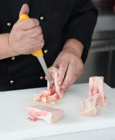 Eliminate con uno scortichino le nervature dello stinco, poi scalcate la polpa dall'osso tagliato a metà. Asportate il midollo dall'osso raschiandolo con un coltellino (ve ne serviranno circa 50 g, potete acquistarlo già sfuso).