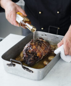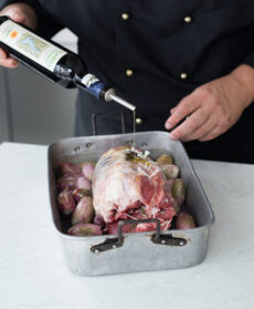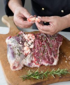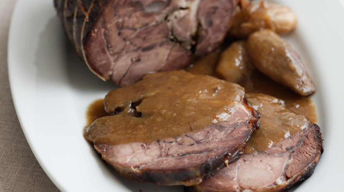 Lo stinco è farcito con il suo midollo e profumato al rosmarino. La lunga cottura in forno rende la carne tenerissima e succulenta. La nota dolce arriva dal perfetto in perfetta armonia con la salsa di scalogni