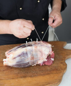 Richiudete lo stinco e legatelo ben stretto prima con due giri di spago a croce in senso orizzontale, poi praticate tante singole legature nell'altro senso, iniziando dalla parte più grossa.