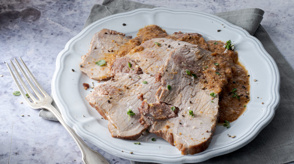 La lunga cottura rende la polpa tenera del vitello morbidissima. La carne lardellata con un trito di prosciutto, scorza di limone e aglio, rilascia al palato tutte le note aromatiche