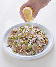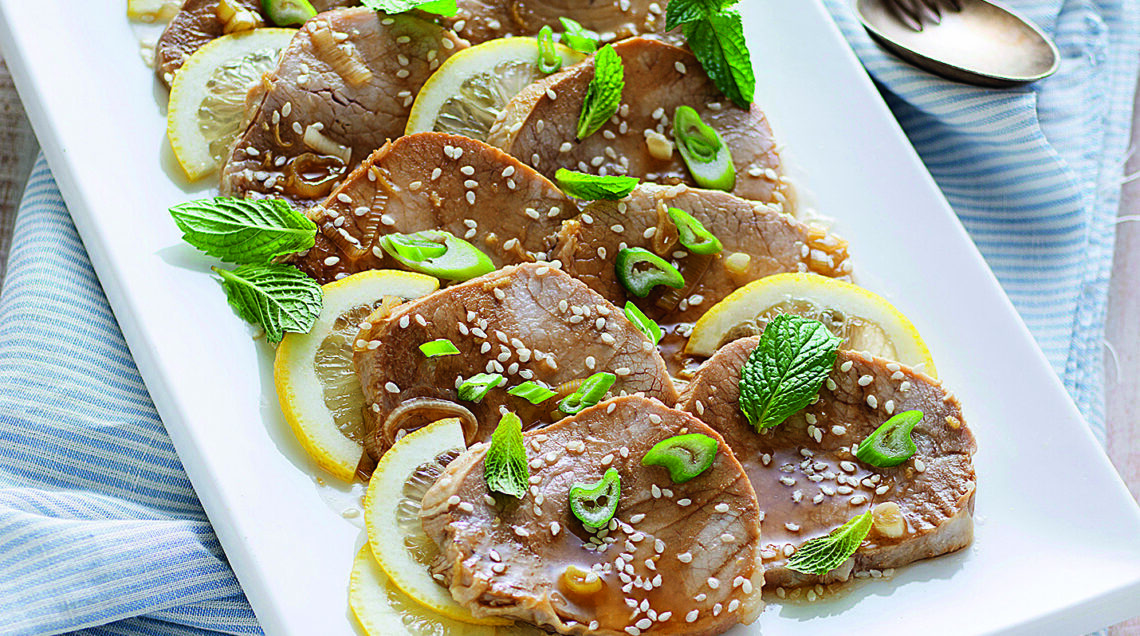 Il girello lessato e tagliato a fette è condito con una salsina di brodo, limone, zucchero e sakè. Da preparare in anticipo per un pranzo all'aperto