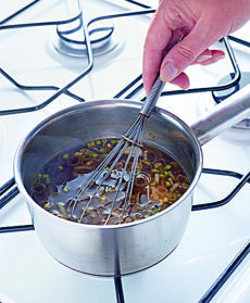 Miscelate con una frusta 400 ml del brodo della carne con l'amido di mais e poi unite la scorza grattugiata di 1 limone e il succo di entrambi, il sakè rimasto, lo zucchero di canna e un pizzico di sale. Fate addensare su fuoco medio mescolando con una frusta e aggiungendo altro brodo se dovesse addensarsi troppo. Filtratela e poi scaldatela nuovamente. Versatela sul vitello e completate con semi di sesamo, menta e fettine di limone.