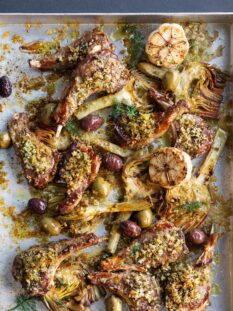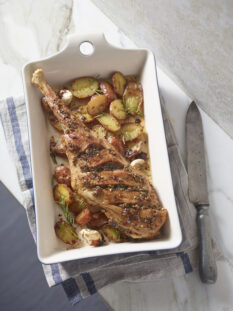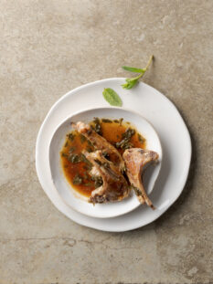 Sella d’agnello cotta a bassa temperatura, insalatina di cipollotto fresco e coriandolo e patata mantecata allo zafferano