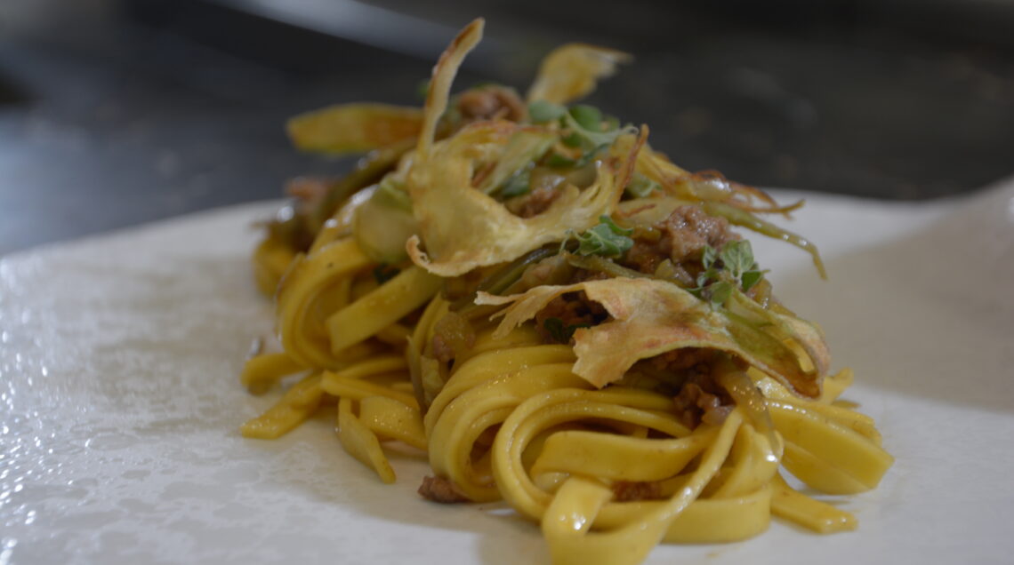 Tagliatelle fatte in casa con carciofi stufati e ragout di agnello