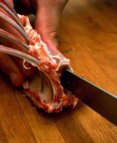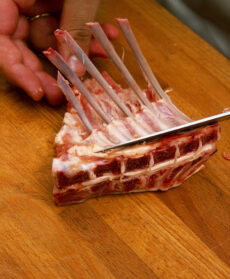 Tagliate il carré in 4 pezzi, elimina con un coltello le pellicine e il grasso in eccesso e scopri le costole.