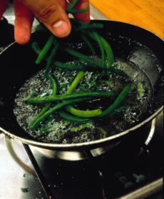Lessate intanto i fagiolini, scolateli ancora croccanti e fateli insaporire in una padella con il burro, la menta e poco sale.