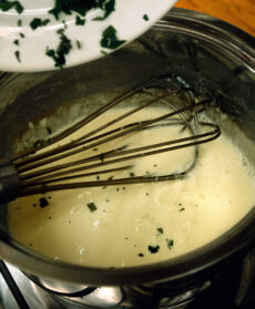 Per la salsa, fate addensare la panna su fuoco basso, salala e profumatela con le erbe tritate.
