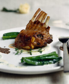 Servite il carré d'agnello tartufato con i fagiolini e la salsa agli aromi.
