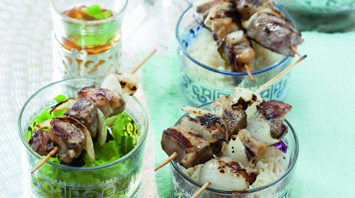 Spiedini di carne ovina marinata nello yogurt con succo di cipolla e limone. La cottura alla brace rende la polpa succosa