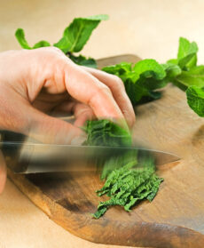 Per un’ottima ricetta della lombata arrosto, per prima cosa devi preparare la salsa di menta. Per prepararla, lava e asciuga circa 50 g di foglioline di menta e poi tagliale alla julienne. Metti le foglioline di menta tagliate in una ciotola, aggiungi metà aceto bianco e metà acqua bollente, nella quale avrai precedentemente messo un cucchiaio di zucchero, del sale e del pepe. Lascia riposare il tutto per circa un’ora.