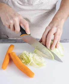 Riducete il cavolo a julienne. Lavate le carote, raschiatele e grattugiatele con la grattugia a fori grossi. Condite le verdure con sale e aceto e lavoratele con le mani perché emettano il succo. Unite il ginepro pestato e cuocete i crauti per 10 minuti in un wok con un po' d'olio.