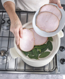Riempite con due dita d'acqua una casseruola, inserite il cestello per la cottura a vapore (l'acqua non deve toccarlo) e foderatelo con le foglie di alloro.
