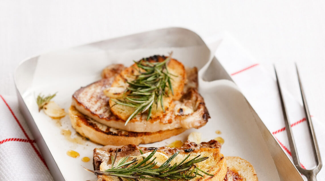 3) Appoggia sopra il pane un rametto di rosmarino e gira per un’ultima volta per tostare anche la seconda fetta. Servi caldo e gusta tutto il sapore di questo panino tradizionale dell’Italia centrale, detto appunto braciole panuntella.