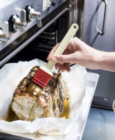 Appena la carne è rosolata, bagnala con un bicchiere di vino bianco e prosegui la cottura a 180° per circa 1 ora e 1/2, bagnandola spesso con il suo fondo. Verso fine cottura diluisci 2 cucchiaini di miele in un bicchierino di brandy, spennellalo sull’arrosto e rimetti in forno a 200° per 10 minuti.