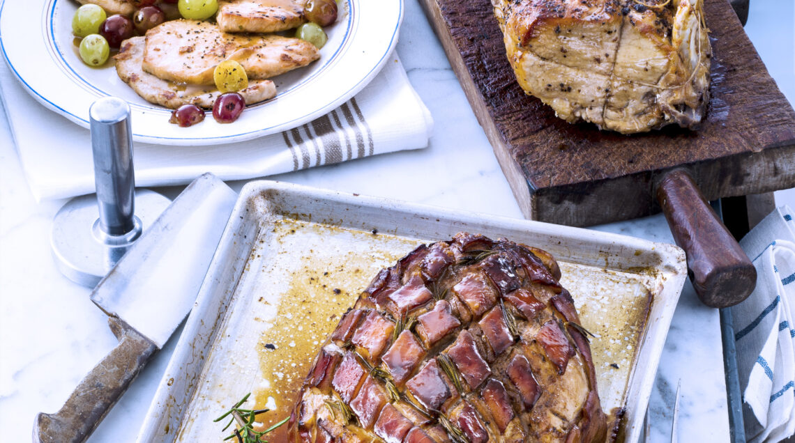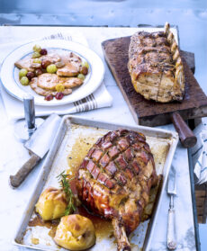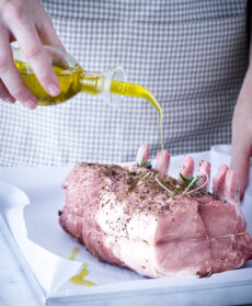 Inserisci in un pezzo di carré di 1,5 kg qualche ciuffo di rosmarino e alcuni filettini di aglio, cospargilo con 1 cucchiaino di bacche di ginepro pestate, sale e pepe, sistemalo su una placca foderata con carta da forno, condiscilo con un filo di olio e inforna a 200°.