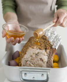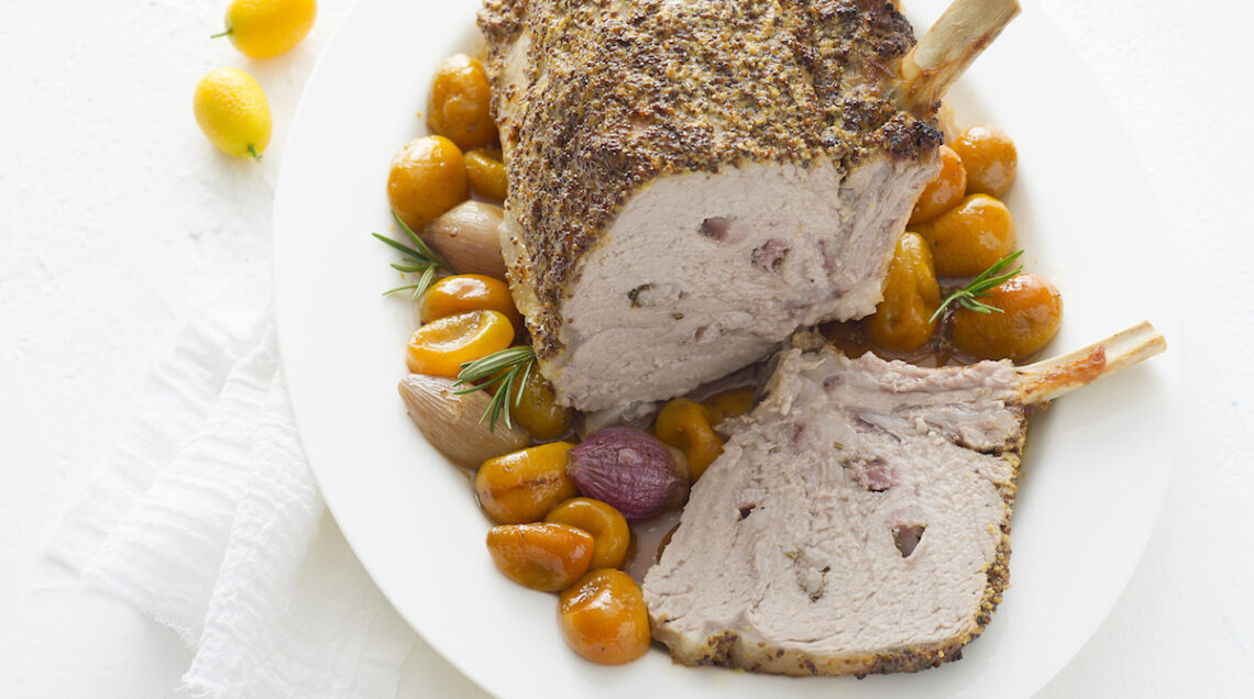 La carne di maiale lardellata con la pancetta e ricoperta di senape cuoce in forno tra la dolcezza del miele e l'aroma del liquore all'arancia