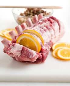 Incidete il carré con tagli profondi tra gli ossi, farcite ogni taglio con un po' di salsiccia e una rondella d'arancia e legatelo ben stretto con lo spago da cucina, in modo da ricomporlo e tenerlo in forma.