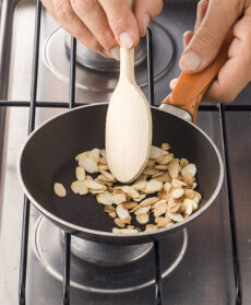 Regolate di sale e cospargete con una manciatina di foglioline di timo e le mandorle a lamelle tostate a parte in un padellino antiaderente; servite.