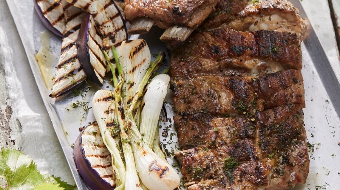 3) Sistematela nuovamente sul barbecue e cuocetela per altri 35-40 minuti, girandola una volta. Mondate i cipollotti e le melanzane, tagliate i primi a metà nel senso della lunghezza e le seconde a spicchietti e cuocetele sulla griglia. Levate le costine dalla stagnola, dividetele in 4 porzioni e servitele con le verdure condite con una presa di sale e 4 cucchiai d'olio.
