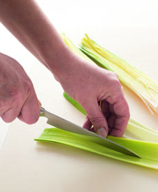 Pulite il porro privandolo di radichette e foglie esterne più dure. Tagliatelo a metà nel senso della lunghezza e riducetelo a strisce sottili. Scottatele per 15 secondi in acqua bollente salata, scolatele e trasferitele subito in acqua e ghiaccio; sgocciolatele dopo 2 minuti.