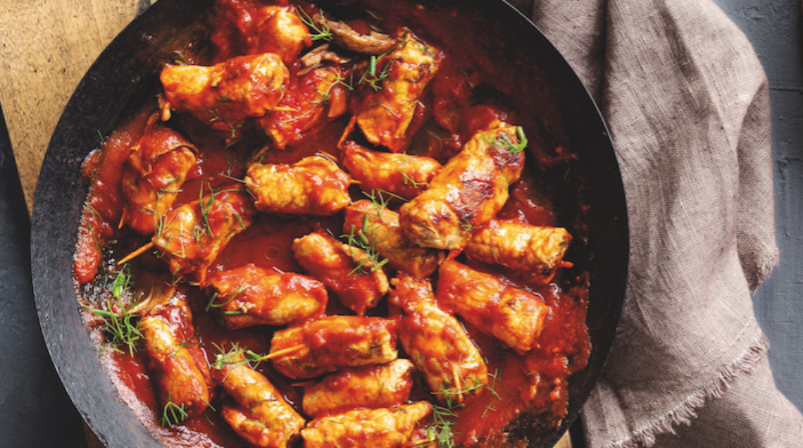 Una preparazione leggera a fronte della ricchezza di sapori: le fettine di lonza, farcite con il trito di acciughe e finocchietto, cuociono nel sughetto di pomodoro ai funghi e fanno il pieno di gusto. Involtini semplici ma molto saporiti, perfetti anche per condire pappardelle o maccheroni Gli involtini si preparano con fettine sottili di carne, pesce, verdure farcite solitamente con un trito aromatico, spesso rafforzato da tocchetti di formaggio o di salumi. Quelli piccoli possono essere fissati stecchini di legno, quando invece sono grossi, è meglio legarli con il spago da cucina per evitare che il ripieno esca durante la cottura.